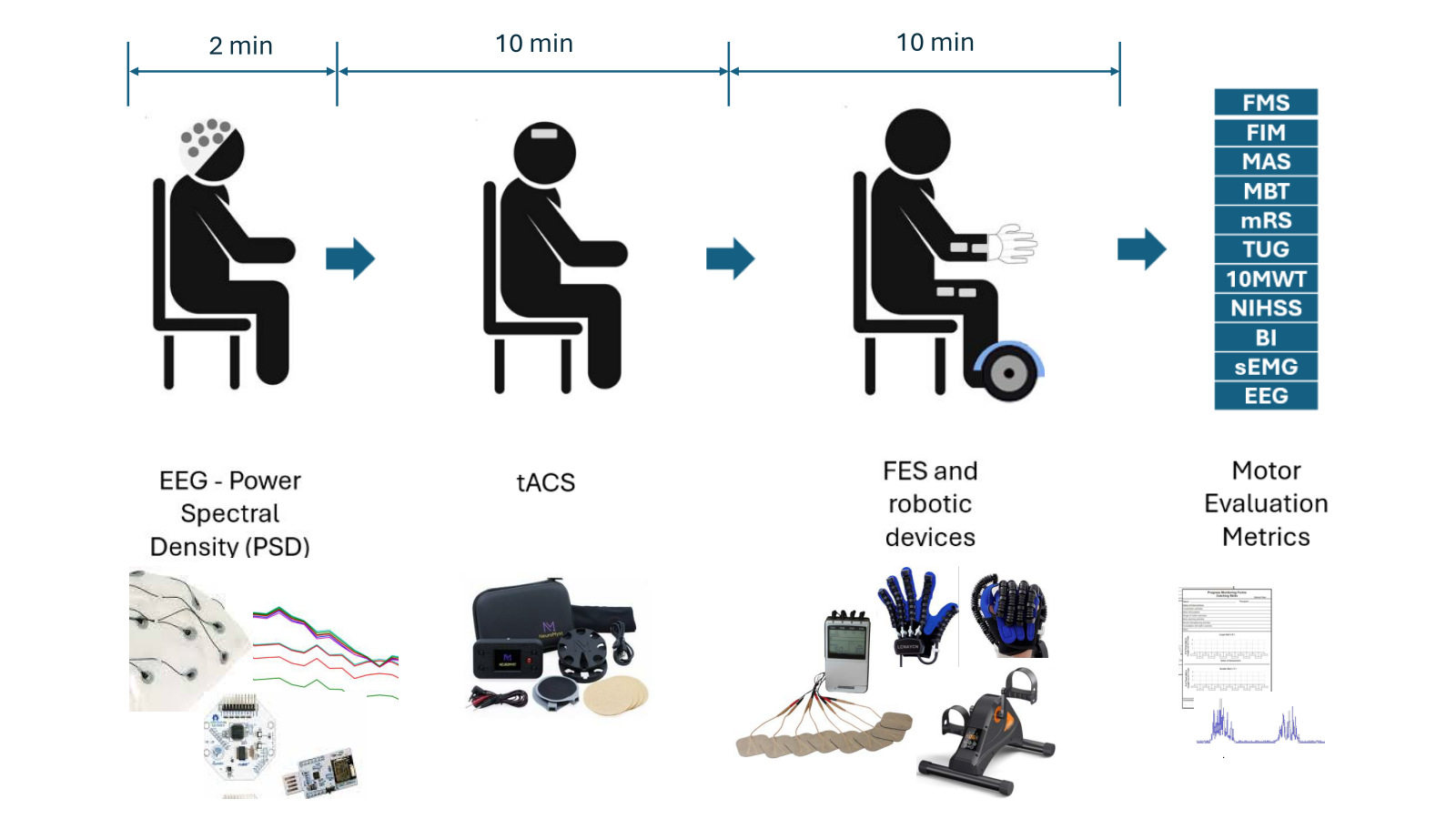 This protocol was developed through a literature review and expert consultation in neurology, rehabilitation, and engineering. It integrates biosignal-controlled robotic technology to capture patient intent and stimulation technologies to enhance motor activity. Evaluation is based on standard rehabilitation metrics.