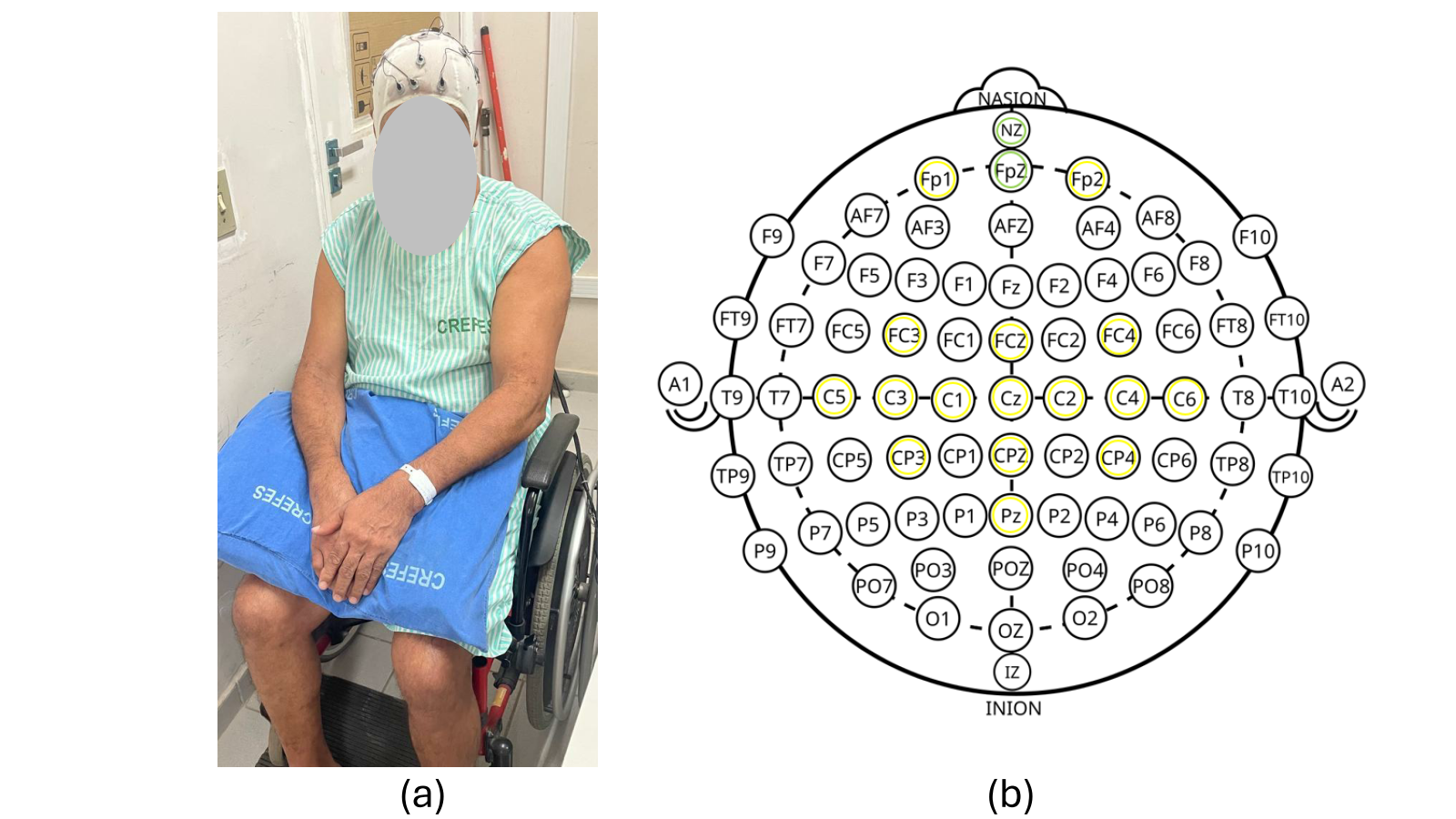Figure 3(a) shows the patient wearing the EEG cap, which is used to recognize MI patterns when imaging limb movements, and Fig 3(b) shows the electrodes used to acquire the EEG signals.