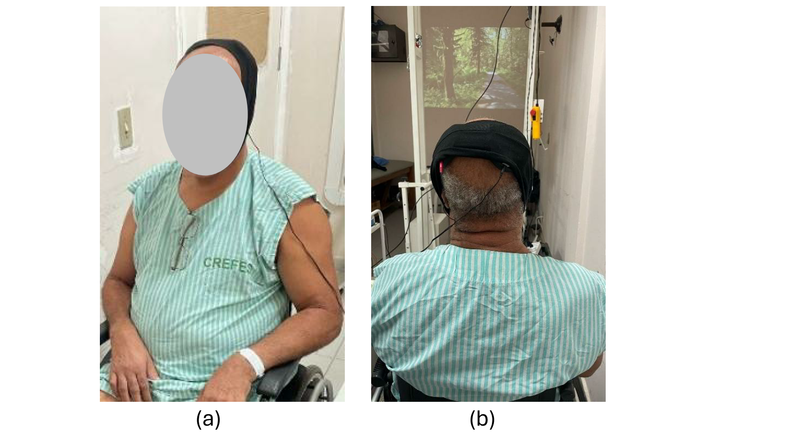 Figures 4(a) and 4(b) show the patient receiving tACS. It worth mentioning that during the tACS application the patient is instructed to conduct MI of the paralyzed limbs while watches a videoclip showing a person strolling in a field.