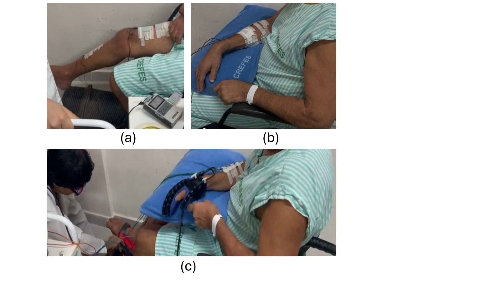 Once the tACS procedure is completed, the patient is prepared for the next step of the protocol, which is to receive electrical stimulation from the FES device as well as passive movements from both the robotic monocycle and the robotic glove during MI. For the electrical stimulation, an FES device (Balego, USA) was used to target the finger flexors and extensors simultaneously, with the following parameters: alternating mode, 1-s ramp, 7-s on-time, 12-s off-time, frequency of 45 Hz, and pulse width of 250 µs. For the rectus femoris and tibialis anterior muscles, the following parameters were used: synchronous mode, 1-s ramp, 7-s on-time, 12-s off-time, frequency of 60 Hz, and pulse width of 300 µs. The stimulation intensity was adjusted based on the patient’s comfort level.