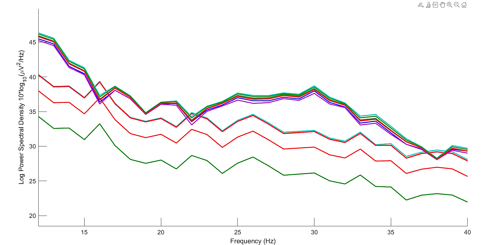 Peak values of Power Spectral Density (PSD) were found in the range of 8 to 30 Hz, as shown in Fig. 6. However, based on studies by [10], more efficiency of tACS is found for frequencies in beta band. Thus, we select the peak of 30 Hz as the stimulation frequency for the tACS device.