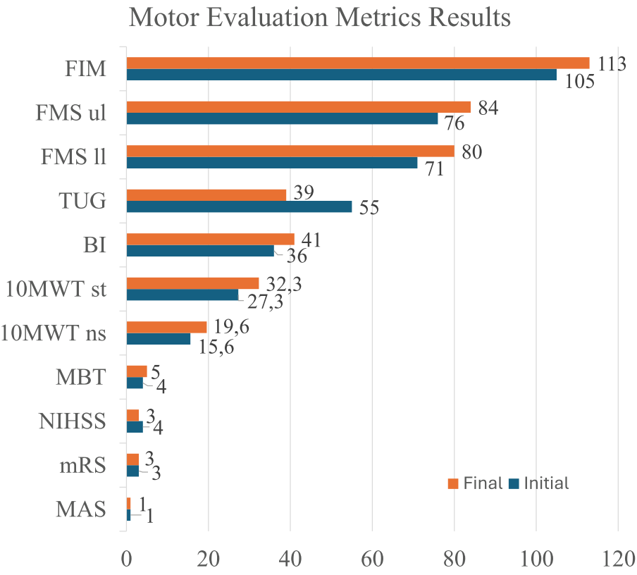 From these results, we do believe that these improvements were due to our therapy, which facilitated neuromodulation, enhancing the excitability of the motor cortex and improving muscle activation, as well as reducing spasticity and allowing for greater voluntary contraction during evaluations.