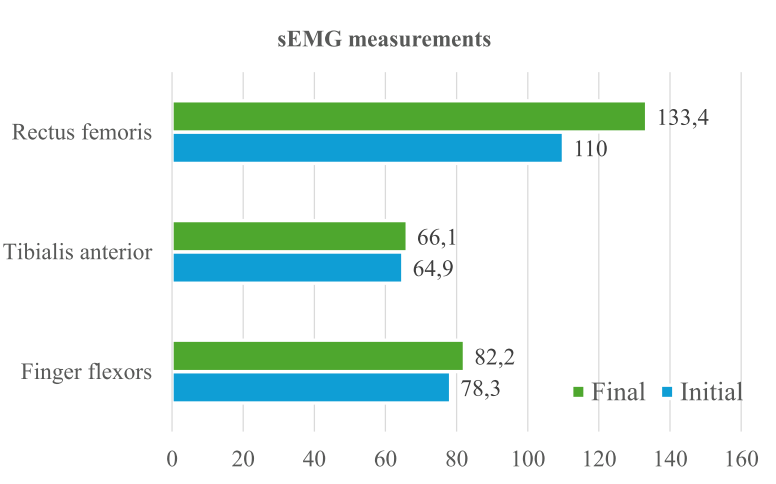 The tibialis anterior muscle presented a peak of 64.92 μV in the initial evaluation, and 66.06 μV in the final evaluation, representing ≃2% increase; and the rectus femoris muscle had a peak of 110.02 μV in the initial evaluation, and 133.43 μV in the final evaluation, representing ≃ 21%. However, the fingers’ extensor muscles did not show improvement in this evaluation.