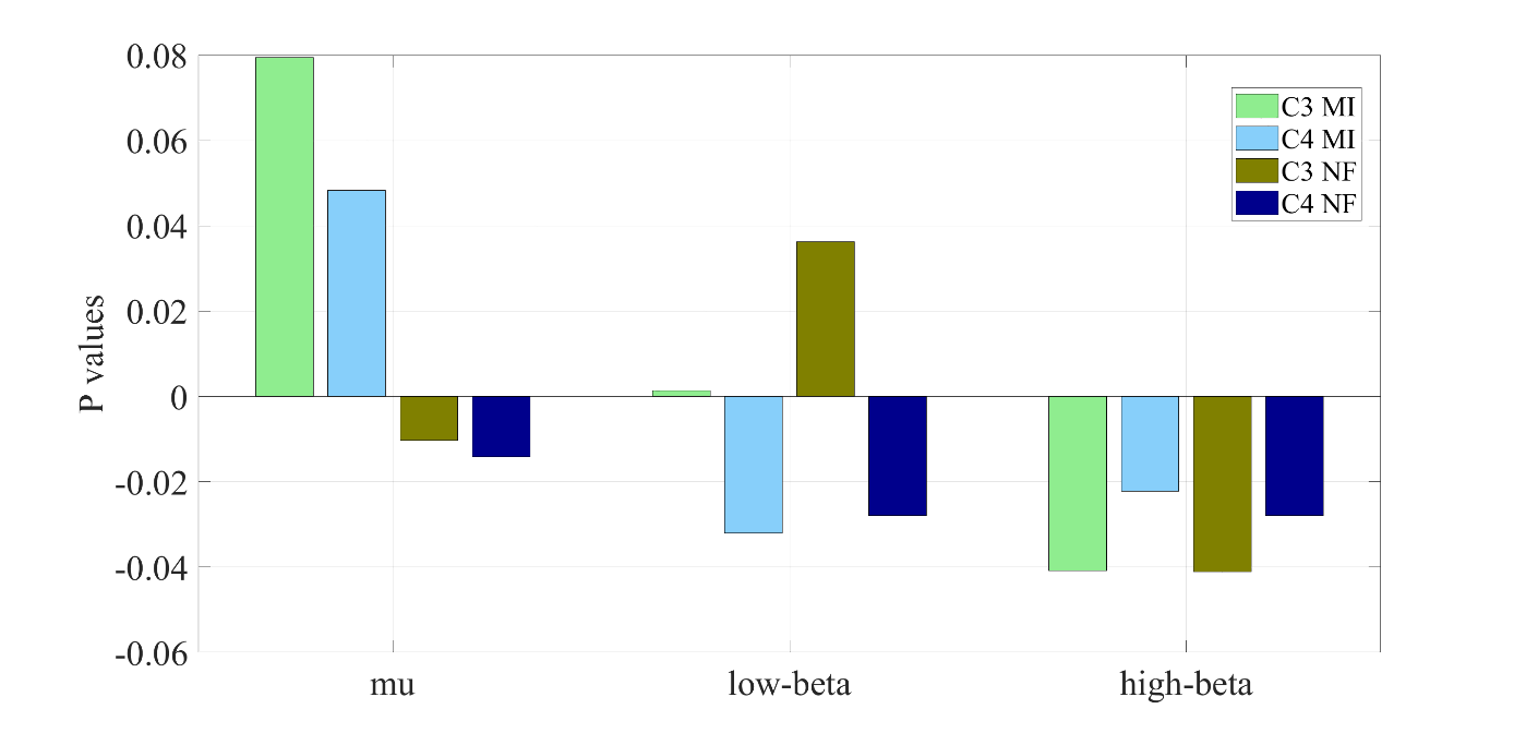 In the mu band, P values in C3 and C4 decreased during NF, reaching negative values, whereas they remained positive during MI without feedback. In the low-beta band, P values increased in C3 but became negative in C4 when comparing MI and NF. In contrast, high-beta exhibited a distinct pattern, with consistently negative P values in both C3 and C4 across MI and NF conditions, though lower P values were observed during NF. Negative P values suggest stronger engagement or Event-Related Desynchronization (ERD), which is often desirable in MI-based BCIs, reinforcing the idea that NF enhances MI performance compared to MI alone. Regarding the energy variation in mu and beta bands,