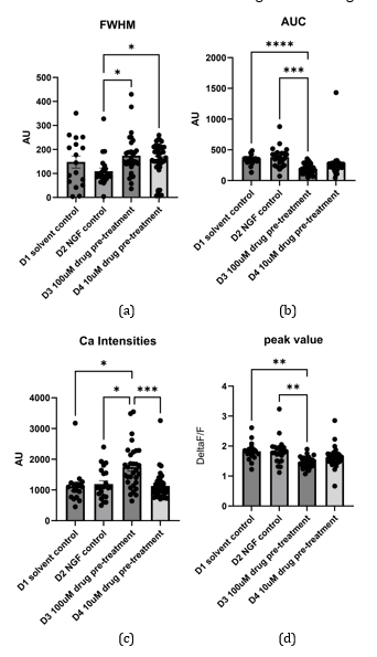 After adding 100 µM of the drug, the peak value of the calcium signaling decreased, compared to the control groups that didn’t have the drug. This meant that the HBW drug was able to reduce calcium excitability, which regulated pain. The FWHM showed the duration of the highest peak of calcium levels. The duration of the calcium spike was different in the control group with NGF, versus the group with NGF + medicine pretreatment. Thus, HBW‑004285 modulated and maintained the calcium levels, even with increased NGF. Comparing D3 and D2, calcium displacement was a lot smaller in HBW‑004285-treated neurons. Relative to NGF alone, both doses reduced time‑integrated activity, with the clearest effects in FWHM and AUC; peak ΔF/F₀ showed smaller and sometimes non‑significant changes.