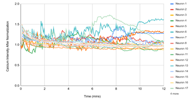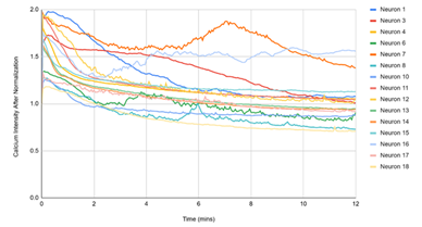 The experimental design included four separate samples of mouse DRG neurons. As illustrated in Table 2, Dish 1 compared cell behavior before and after the addition of DMSO. Dish 2, 3, and 4 pre-stimuli included cells and DMSO, and post-stimuli included NGF in all dishes. Dish 2 served as the control, with no drug dosage; Dish 3 included 100 µM of the inhibitor (HBW-004285) post-stimuli; and Dish 4 included 10 µM. Before imaging, cells were loaded with Fluo-4 AM, a fluorescent calcium indicator, to visualize calcium signaling. Images were then captured for 15 minutes, before and after the stimuli, using a Zeiss 40x objective microscope at 3-second intervals per sample. The average brightness of the cells, reflecting calcium intensity, was measured using ImageJ at pre-stimulation, immediately post-stimulation, and 5, 10, and 15 minutes post-stimulation. The values were then normalized and compiled into graphs.