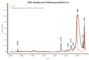 Grafting was confirmed via solvent extraction (dichloromethane, 24hr) and FTIR. Unmodified PBAT/talc (69/30) blends showed complete separation: extracted pure PBAT and residual pure talc (FTIR peaks: 1009 cm⁻¹ Si-O-Si, 670 cm⁻¹ Si-O-Mg). In contrast, silane-modified blends (e.g., PBAT/talc/VTMOS/Luperox 70/30/1/0.1) yielded only ~55 wt% extractable PBAT. FTIR of the non-extractable residue showed characteristic peaks of both PBAT (1715 cm⁻¹ C=O, 729 cm⁻¹ benzene, ~2950 cm⁻¹ -CH₂-) and talc (shifted Si-O-Si peak at ~968 cm⁻¹, 667 cm⁻¹ Si-O-Mg), as shown in Figure 1, confirming PBAT-talc copolymer formation via Si-O-Si bonds from hydrolyzed silane.