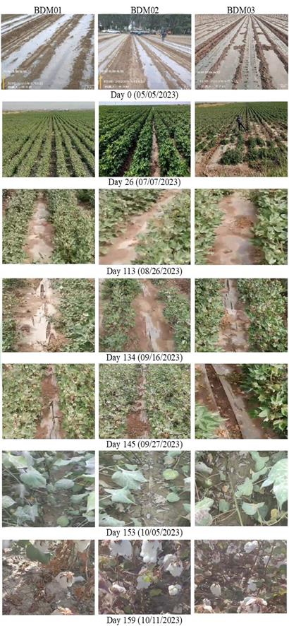 Throughout the planting time, ground temperature was measured by using automatic temperature recording probes (accuracy ±0.2 °C) which were buried at a depth of 10 cm. Data was recorded every 60 minutes at each of the three different locations per treatment group, then daily average temperatures were calculated. The state of degradation of the films was observed every 10 days post-application and classified by stage. The stages were determined by the size of cracks on the film: induction (≤2 cm cracks), cracking (2–20 cm), fragmentation (>20 cm), disintegration (residues ≤16 cm²), and disappearance. Plant height, boll count, average single boll weight, and yield were measured as crop metrics during the harvest.