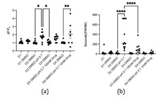 Fluorescence intensity quantifications were made using FIJI ImageJ. The background of each image was subtracted before quantifying the fluorescence of the cell body. All traces were normalized to the mean baseline before stimulation. MATLAB was utilized to find the peak properties of each Ca2+ transient. GraphPad Prism was used to find statistical significance. Signals were normalized to baseline (ΔF/F₀; baseline window 60 s). For each trace, peak amplitude, full width at half maximum (FWHM), and area under the curve (AUC) were quantified. To avoid replication, dish‑level means (cells nested within dishes) were computed. Data were reported as mean ± SEM with 95% confidence intervals and the exact p‑values.