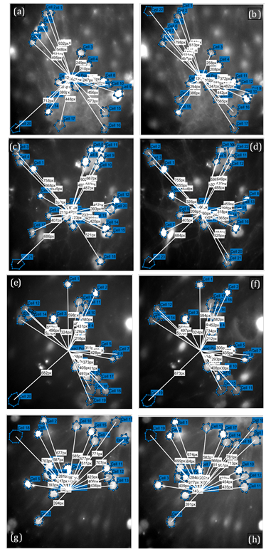 The geometry and cell selection used for quantitative Ca²⁺ analysis was carefully recorded. During ROI selection, any cells with ambiguous borders or overlap in the imaging plane were excluded to minimize ROI cross‑contamination. In Figure 2, the blue circles mark the analyzable cell bodies, and the white vectors register each cell’s radial distance from the stimulation center, ensuring that distance‑to‑stimulus is tracked consistently when extracting ΔF/F₀ traces. Across panels, the number and spread of ROIs were broadly comparable within each dish pair (baseline vs treatment), indicating that subsequent differences in waveform metrics (e.g., FWHM and AUC) were unlikely to arise from systematic changes in field‑of‑view geometry or proximity to the stimulus. These annotations were generated during preprocessing (drift registration, ROI placement, background ROI, and distance export) and served as methodological context for the quantitative results reported in the main figures. These overlays were generated with MATLAB and ImageJ/FIJI workflow, which includes selecting the pre‑stimulus frame, adding a background ROI, saving per‑cell distances for each field of view, and quantitatively extracting ΔF/F₀ traces and waveform features (peak, FWHM, AUC). The raw frames here served as qualitative context for those measurements and documented ROI placement and distance mapping used in the subsequent analyses.