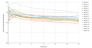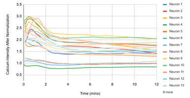 The experimental design included four separate samples of mouse DRG neurons. As illustrated in Table 2, Dish 1 compared cell behavior before and after the addition of DMSO. Dish 2, 3, and 4 pre-stimuli included cells and DMSO, and post-stimuli included NGF in all dishes. Dish 2 served as the control, with no drug dosage; Dish 3 included 100 µM of the inhibitor (HBW-004285) post-stimuli; and Dish 4 included 10 µM. Before imaging, cells were loaded with Fluo-4 AM, a fluorescent calcium indicator, to visualize calcium signaling. Images were then captured for 15 minutes, before and after the stimuli, using a Zeiss 40x objective microscope at 3-second intervals per sample. The average brightness of the cells, reflecting calcium intensity, was measured using ImageJ at pre-stimulation, immediately post-stimulation, and 5, 10, and 15 minutes post-stimulation. The values were then normalized and compiled into graphs.