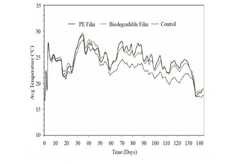 Three treatment groups were tested: 10.2 μm thick biodegradable film (sample #2), 12.1 μm thick PE film, and bare soil (control). A thinner BDM was chosen due to stronger tensile properties of the biodegradable films vs. PE mulch films, but both types of films were laid down with a cross-sectional width of 205 cm. A randomized block design was conducted with three replicates per treatment group. Traditional bare soil served as control.