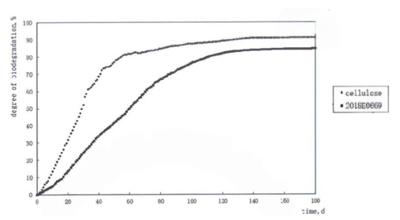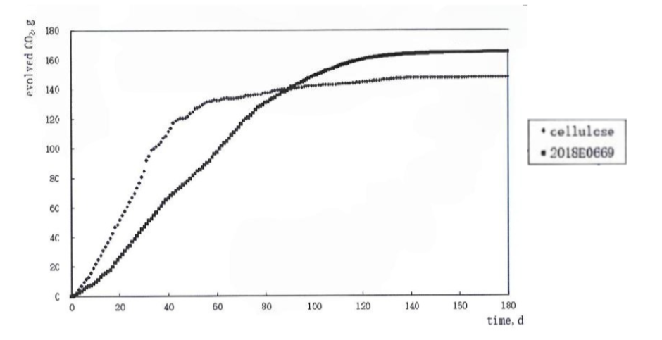 Biodegradability under composting conditions was assessed according to ISO 14855 or equivalent standards. Test material (Sample #2 film) and positive control (semi crystalline cellulose) were mixed with mature compost in vessels maintained at 58±2°C and above 50% moisture levels. The total organic carbon (TOC) was around 12%, the pH was about 7.8, and the volatile solids content (VS) above 55%. Evolved CO₂ was monitored continuously by infrared analysis over 180 days. The degree of biodegradation was calculated as (CO₂ from test material) / (Theoretical evolved carbon dioxide (ThCO2)) x 100%, and disintegration was assessed visually and gravimetrically (mass loss). The degradation data was collected over time. As shown in Figure 2 and Figure 3, in standard compost pile, the observed degradation rate is at approximately 24% per month in the first three months, slow down to 18% in Month 4, and then reached a plateau of around 90% mineralization by day 120, achieving an average of 92.8% biodegradation by day 180. Plant growth (ryegrass, cress) and earthworm survival tests in compost-amended soil showed no adverse effects compared to blank compost controls, meeting ecotoxicity requirements. As shown in Table 4, gravimetric analysis showed a 98.4% average disintegration in sample 2. Visual observation confirmed the progressive fragmentation and disappearance of our test material. Furthermore, all of the results of sample #2 met the ASTM D6400 requirements.
