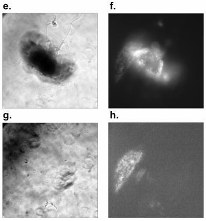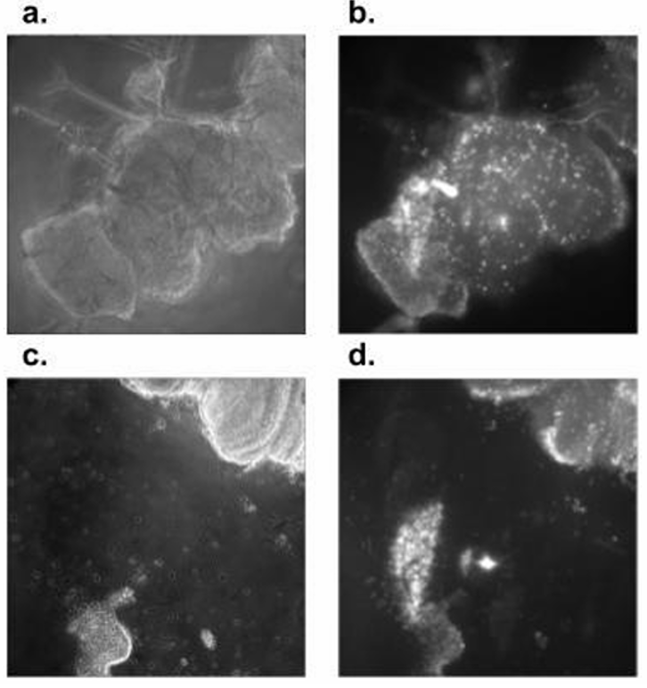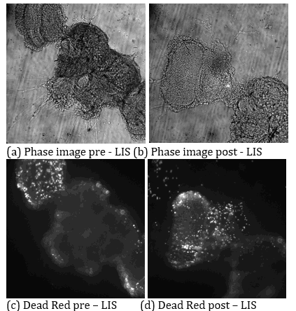 In this study, Drosophila melanogaster brain tissue was imaged for the first time on a Zeiss fluorescence microscope and was subjected to multiple LIS exposures. Phase contrast images acquired pre-LIS (Figure 3(a)) and post-LIS (Figure 3(b)) demonstrated pronounced morphological alterations consistent with mechanical perturbation. Dead Red fluorescence images obtained pre-LIS (Figure 3(c)) and post-LIS (Figure 3 (d)) indicated an increased prevalence of membrane-compromised cells localized to the shocked region. Together, the phase and viability channels provided complementary evidence of LIS-induced structural and cellular injury in intact brain tissue.