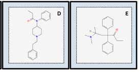 Morphine (Figure 1A) is a non-synthetic narcotic and is utilized as a painkiller [7]. Originating in the United States and derived from opium, morphine induces euphoric feelings that lead to tolerance and dependence, resulting in a high potential for abuse [7]. Oxycodone (Figure 1B) is a semi-synthetic narcotic that induces feelings of relaxation and serves as an analgesic for pain relief [8]. Oxycodone is primarily marketed through OxyContin, and the product is legal under Schedule II of the Controlled Substances Act, meaning that although it is currently accepted for medical use in the United States, it has a high potential for abuse and may lead to severe physical or psychological dependence [8]. Euphoria is the most common effect of oxycodone usage, hence the opioid has a high addictive potential for abuse [8]. Heroin (Figure 1C) is an illegal semi-synthetic opioid derived from morphine that induces euphoria [9]. Heroin is extremely addictive and is classified as a Schedule I drug, meaning that it has no safe, accepted medical use in the United States due to its high abuse potential [9]. Fentanyl, (Figure 1D), is a synthetic opioid analgesic and a highly addictive drug [10]. Fentanyl is approximately 100 times more potent than morphine and approximately 50 times more potent than heroin [10]. A fentanyl dosage as small as 0.25 mg is considered a potentially lethal dose [10]. Due to fentanyl’s high potency, it is much more deadly, and transdermal fentanyl can kill [11]. Unlike heroin, fentanyl has FDA-approved commercial medical use for post-surgery chronic pain [10]. Fentanyl also induces euphoric effects similar to other commonly used opioids, such as morphine [10]. Methadone, (Figure 1E), is a synthetic opioid that is primarily used in treating opioid use disorder and managing chronic pain [12]. Methadone’s unique characteristics, such as its lipophilic nature and long half-life, contribute to its high potency and long-lasting effects on opioid receptors and signal transduction pathways [12].
