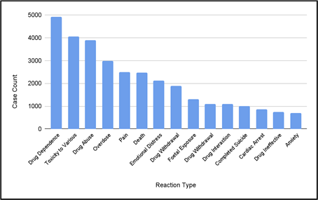 When adverse events are classified by reaction type, the greatest proportion of reported adverse events for methadone, 21.8%, involved drug dependence (Figure 7). Toxicity to various agents, drug abuse, and overdose were also frequently reported adverse events for methadone.