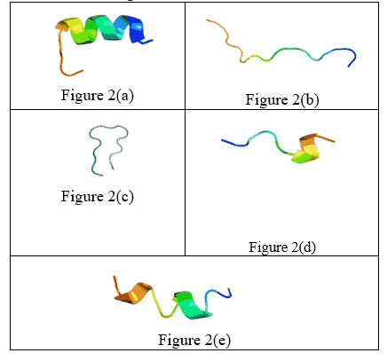 The selection was based on peptides with known or predicted bioactivities relevant to metabolic health. Firstly, from Finger Millet, two peptides, Fig 2(a) and Fig 2(b), as TSSSLNMAVRGGLTR and STTVGLGISMRSASVR were obtained [13]. These peptides were picked from a study exploring protein hydrolysates for their nutraceutical properties. Secondly, one peptide was selected from Pearl Millet, shown in Fig2 (c)- SDRDLLGPNNQYLPK. This was extracted from the work of Himani Agrawal, which characterized functional peptides derived from Pearl Millet proteins using enzymatic hydrolysis and mass spectrometry. Lastly, from Foxtail Millet, two peptides, shown as Fig 2(d) and Fig 2(e)- EDDQMDPMAK and QNWDFCEAWEPCF, respectively. These peptides were selected based on research by Hongbing Chen and Shuai Hu, which employed both in silico prediction and experimental validation [14].