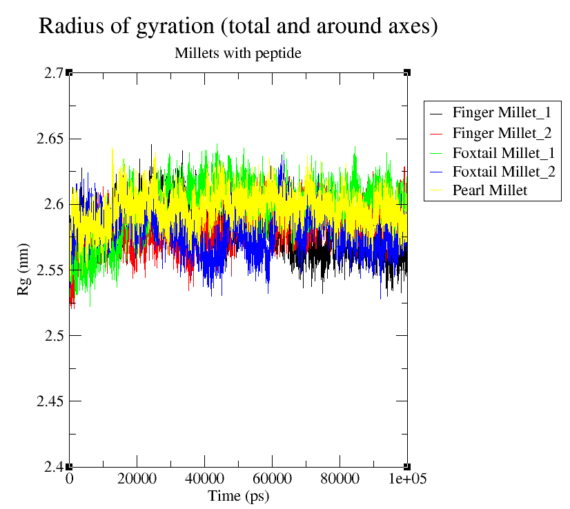 As illustrated in Fig 4(a), all peptide-bound FTO complexes underwent a characteristic RMSD stabilization phase within the first 20–30 ns, followed by consistent fluctuations, indicating that the systems reached equilibrium and remained dynamically stable. Among the complexes, Finger Millet_1 (black) exhibited the highest RMSD values (~1.4–1.5 nm), implying greater structural deviation and flexibility. Foxtail Millet_2 (blue) showed moderate RMSD levels (~0.8–1.0 nm), reflecting a stable yet relatively dynamic interaction. In contrast, Foxtail Millet_1 (green), Finger Millet_2 (red), and Pearl Millet (yellow) maintained lower RMSD values (~0.5–0.7 nm), denoting high conformational stability. Notably, the Pearl Millet complex remained consistently stable throughout the simulation, with minimal fluctuations, indicating strong peptide binding and low conformational drift. Similarly, Finger Millet_2 showed compact behavior with RMSD values remaining under 0.6 nm. These findings suggest that millet-derived peptides, particularly from Pearl and Foxtail Millet, form stable complexes with the FTO protein. The RMSD profiles highlight how sequence-specific interactions can influence structural dynamics and protein stability.