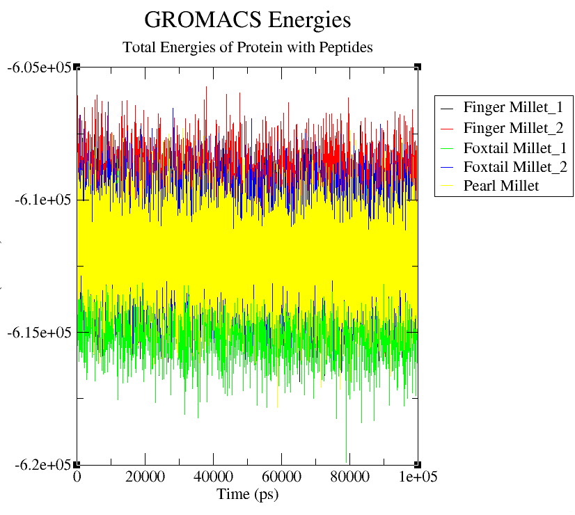 Total energy analysis was performed to examine the thermodynamic stability of the peptide–FTO complexes. As shown in Fig 4(d), all systems reached energetic equilibrium early in the simulation and remained within narrow energy ranges. Pearl Millet (yellow) displayed the most stable energy profile (−6.10 × 10⁵ kJ/mol), indicating strong and favourable peptide binding. Foxtail Millet peptides (green and blue) had slightly lower energies (−6.15 to −6.20 × 10⁵ kJ/mol), reflecting even more energetically stable interactions. Finger Millet peptides (black and red) showed slightly higher energies (~−6.05 to −6.10 × 10⁵ kJ/mol) but remained stable throughout. The consistency of energy values supports the structural and dynamic observations and suggests that millet-derived peptides contribute to the stability of FTO complexes, with foxtail and pearl millet peptides showing the most favourable binding profiles.