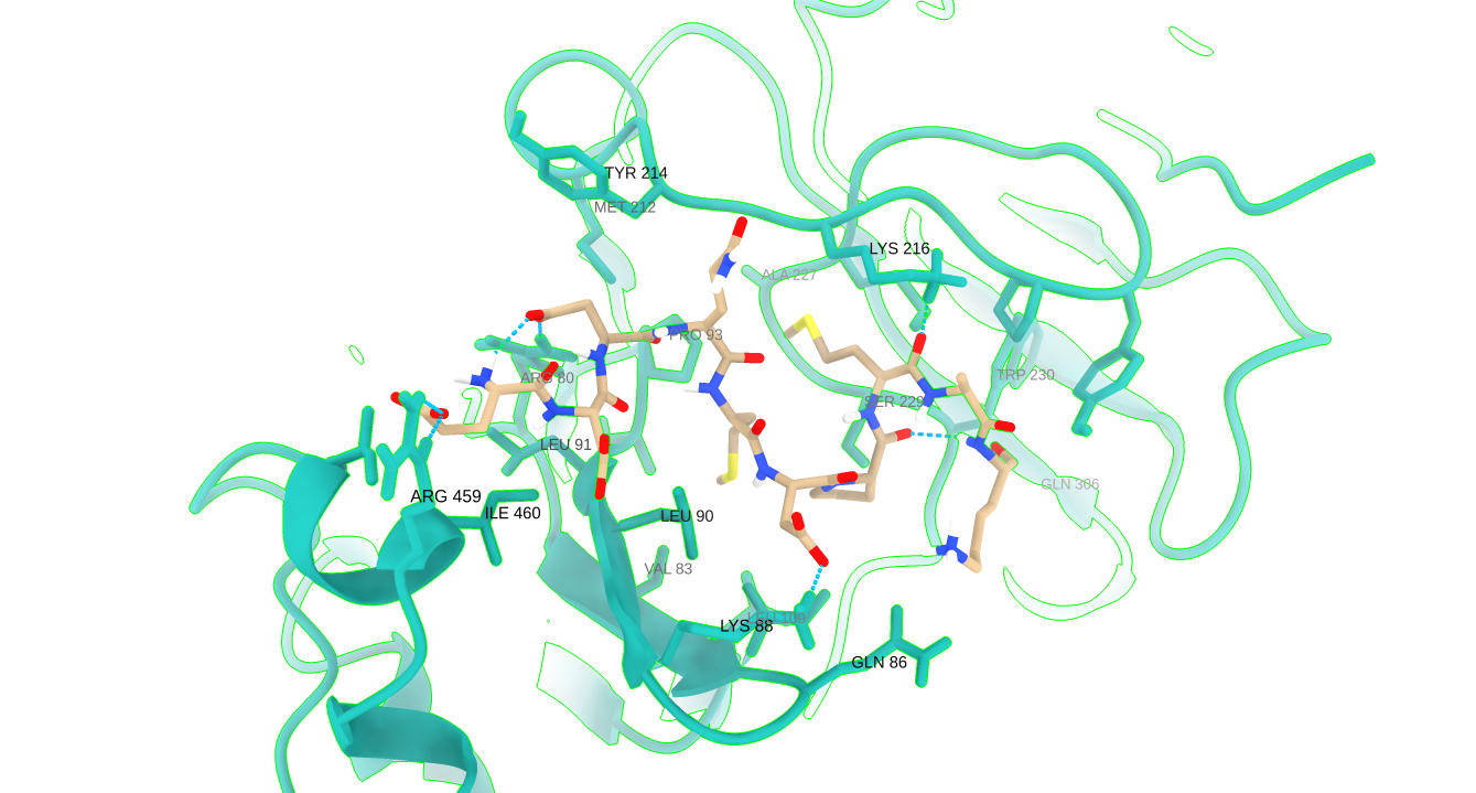 Fig 3 (d): ArgA59, Thr463, Arg80, Met212, Tyr214, Lys216, Met226, Ser229, Tyr220, Gln86, Val83, Lys88, Leu90