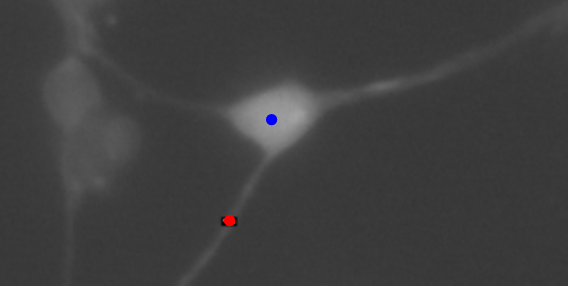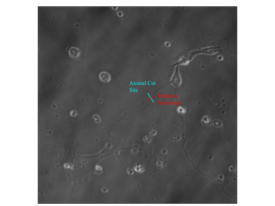 Cortical neurons were collected from the cerebral cortex of P0 mouse pups cultured in Neurobasal A (GIBCO #11090-081) supplemented with 5% FBS Glutmax and B-27 supplements [19]. Cortical neurons were then treated with maintenance media (Neurobasal A, Glutmax, B27) containing either normal (3 mM) or high (25 mM) levels of glucose. After being cultured at these different glucose levels for about 40 minutes, the axons were damaged 20 microns away from the cell body, using the femtosecond laser at a power of 225-275 mw before the 40x objective. Phase images before and after laser ablation were collected at 5-minute intervals. Images were analyzed in ImageJ– the shrinkage created due to laser-inflicted damage was recorded in pixels, as demonstrated in Figure 1. The data of interest (pre-cut, post 30 seconds, post 5 minutes, post 10 minutes, and post 15 minutes) were collected and grouped based on the medium the cells were cultured in (high glucose media and normal glucose media). The average length of the shrinkage was then calculated based on the post time and graphed accordingly.