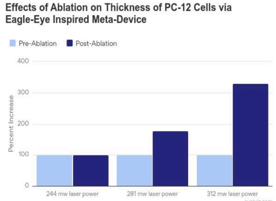 With PC-12, a different experimental process were implemented using different power levels and observing their correlated changes. Cell thickness was minimally impacted at the lowest power, 244 mW, with only a 0.50% change observed, shown in Figure 7A. This suggested that the laser energy was insufficient at this power level to induce significant structural alterations in the cells, likely because the energy absorbed was below the threshold needed to cause noticeable expansion through the ablation. At a laser power of 281mW, a substantial increase in cell thickness was observed, with a 77.55% expansion occurring immediately after laser ablation, shown in Figure 7B. This change indicated that the laser power at this level was sufficient to induce damage, increasing cell volume, likely due to thermal effects or the generation of intracellular stress and swelling. The most pronounced effect was observed at the highest power, 311mW, where the cell thickness increased by 230.53% following laser ablation, shown in Figure 7C. This increase suggested a high degree of cellular disruption, potentially due to the formation of cavitation bubbles or other damage mechanisms induced by the higher energy input. The correlation in Figure 8 implied that as the laser power increased, the extent of cellular damage and subsequent expansion became more significant.