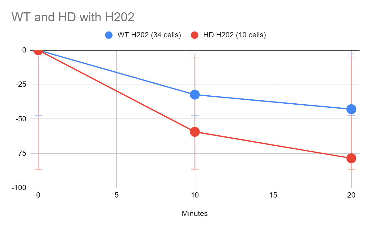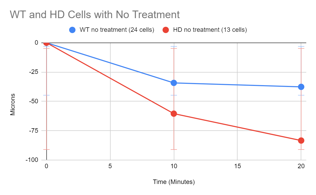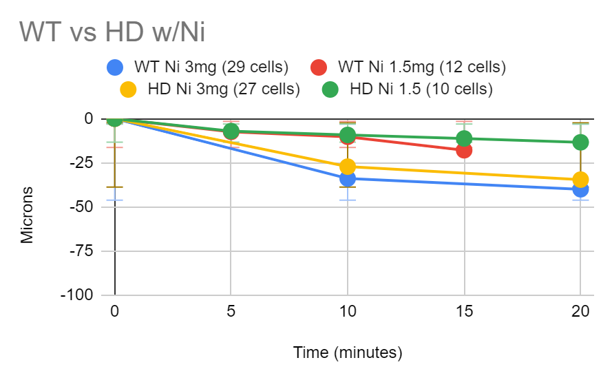 After analyzing the shrinkage of the axon post ablation for the nontreated HD and wild type hippocampal neurons, there was a greater amount of separation within the neurons affected by Huntington’s Disease compared to the wild type neurons, however, there was no significant statistical difference between the separation (Figure 9). For the neurons treated with Ni, there was less degeneration in both wild type and HD cells, signalling that the axon was strengthened, with a greater effect observed in 3.0mg than the 1.5mg, shown in Figure 10. In the neurons treated with H2O2, axonal degradation increased minimally, as seen in Figure 11.