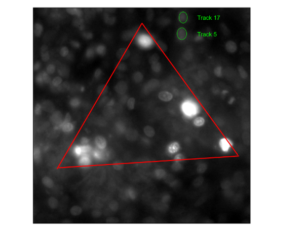 Laser ablation patterns were drawn by hand using a custom-built Labview software, which when initiated, guided the laser through the triangular pattern drawn to ablate the cells. The power before the objective was measured to be 100 mW. An example of this can be seen in Figure 2. Laser ablation was able to replicate myocardial cell loss, creating an artificial border zone to replicate the effects on border cells from the loss of neighboring cells. The TrackMate-StarDist extension on ImageJ was used to create masks and collect the normalized area of border cells at frames before and after ablation. The border cells were marked with red tracks in the phase image (Figure 2). Through a MATLAB code, this data could then be assembled and graphed into several “tracks”.