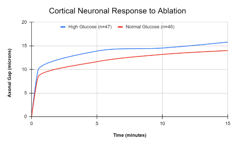 Immediately after ablation, mean axonal shrinkage measured 9.9 µm under high glucose and 8.4 µm under normal glucose (3 mM). At 15 min post-ablation, shrinkage increased to 15.8 µm and 14.0 µm, respectively. Substantial variability was observed, with mean errors of 1.43 µm (high glucose) and 1.04 µm (normal glucose) at 15 min. With the available number of trials, a statistically significant difference between glucose conditions was not detected. Additional experiments with larger sample sizes were judged necessary to determine whether the trend was robust. Nonetheless, the results indicated that laser ablation was a viable assay for probing axonal and neuronal robustness under differing extracellular conditions, including glucose levels.