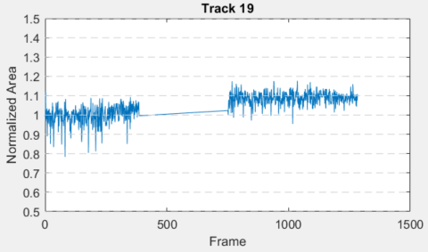 More than 50 border cells outside the triangular ablation zone in Figure 2 were chosen and tracked before and after ablation as shown in Figure 5. Their areas before ablation were normalized to have an area of 1. Many of these border cells experienced changes after the ablation, with three sample tracks being shown below. After ablation, the cell marked as “Track 5” increased by 10% in area and continued to increase in area before reaching a maximum 20% increase. Similarly, tracks 17 and 19 demonstrated a 10% increase in area after ablation. Thus, by creating an artificial border zone with laser ablation, coupled image-tracking software can be used to ascertain changes in cellular shape, and thus the presence of irregular force and stress caused by the absence of neighboring cells. This opened many realms f possibilities when studying border zones caused by myocardial infarctions. For example, cells of different distances away from the border zone can be tracked separately to determine the effects of distance from the border zone on cellular stress.