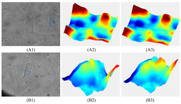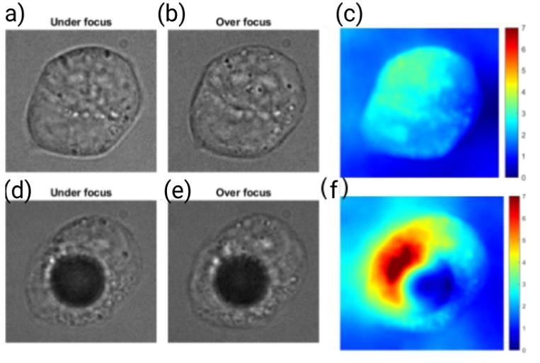 For all experiments, the RoboLase system was used to image the cells in the XY plane. The ablation was carried out in a defined area and the resulting changes in thickness were captured using a QPI methodology named Fourier optical spin splitting microscopy (FOSSMM) [13]. FOSSMM consisted of two lenses, a metasurface, and a polarized camera, allowing for underfocused and overfocused images. The meta-device was 50 μm away from the flat surface of the substrate [21-22]. Imaging the same path was repeated at different depths within the sample thickness by adjusting the position of the sample relative to the focusing arrangement along the beam propagation direction. Using the differences between the images, the QPI was acquired using the transport of intensity equation (TIE) algorithm[23] enabling real-time monitoring cell property changes. Our TIE-based reconstruction and metasurface optics are consistent with recent QPI/metasurface reports and design practice (single-shot amplitude/phase and compact meta-device implementations) [17].